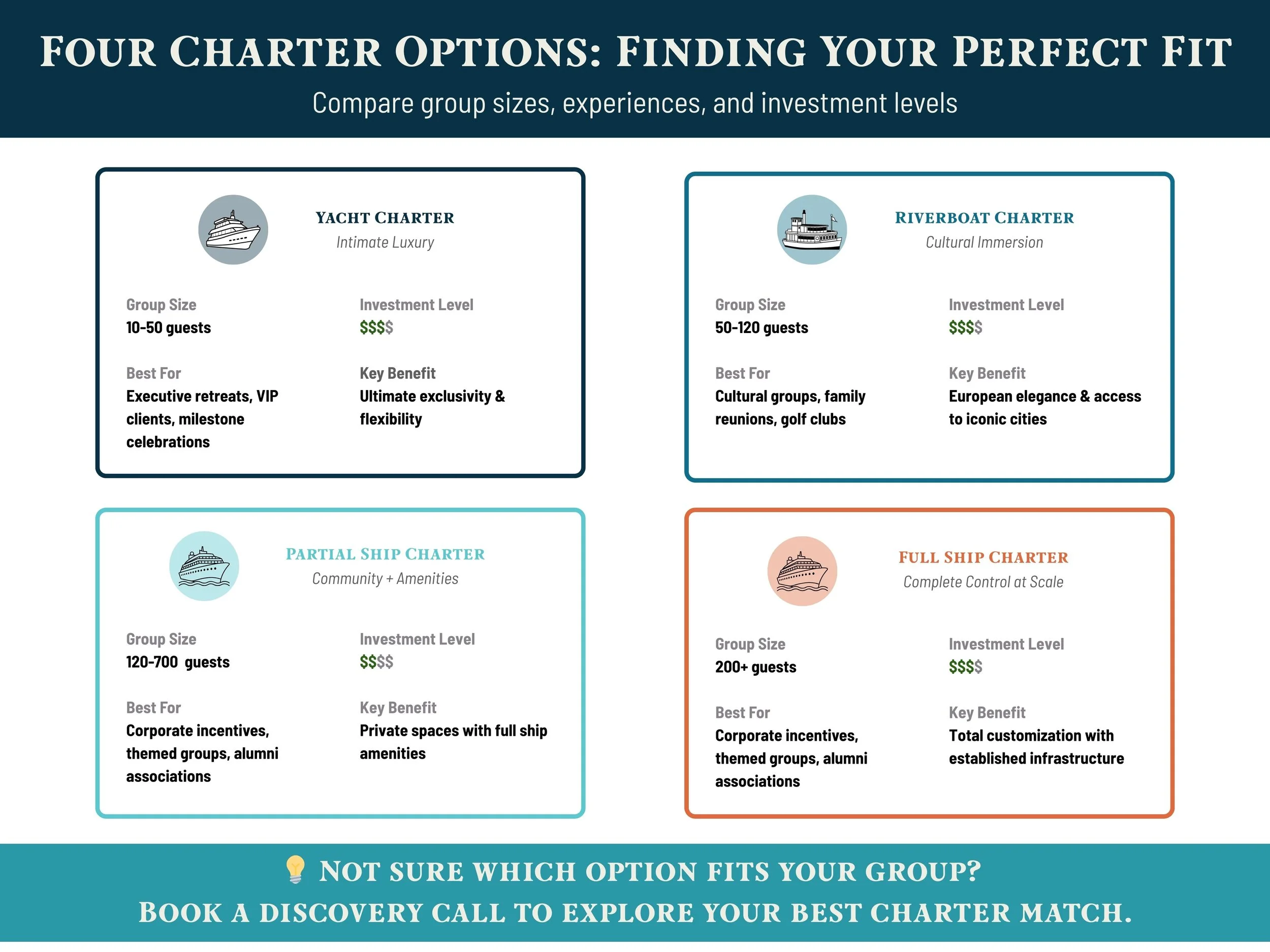 Whether you're envisioning an intimate yacht experience for your top clients, a culturally rich riverboat journey for your community, or a full-ship celebration that brings hundreds together, the right charter can turn your vision into reality.